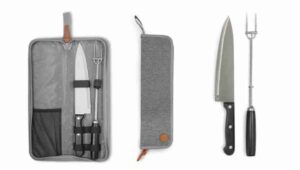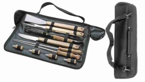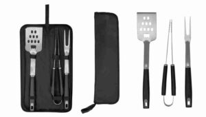 Acero inoxidable. Set de asado en estuche color negro con cierre. Contiene 3 utensilios de acero inoxidable 420: tenedor de 135g y 41 cm de largo; pinza de 275g y 39 cm de largo; y espátula de 225g y 43 cm de largo, todos con mango de polipropileno en color negro. Espátula multipropósito (recoge, escurre, corta y destapa). Calidad premium. Medida 6,5 x 12 x 4,5 cm cerrado.