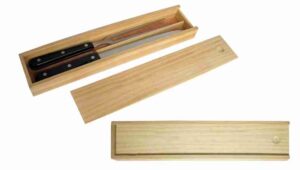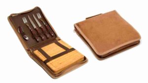 Set de asado para dos personas con funda simil carpincho con cierre perimetral. Incluye 2 platos cuadrados de madera de bamboo, 2 juegos de cuchillo asador y tenedor de tres puntas de acero inoxidable y mango de bakelite marrón. Contiene saca corcho-destapador-navaja. Aprobado por el INAL para el contacto con alimentos. Medida Platos: 21 x 21 cm y 1,5 cm
