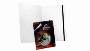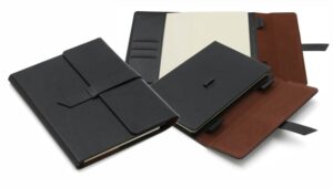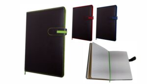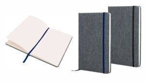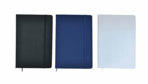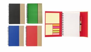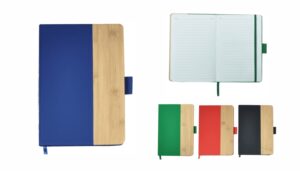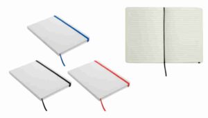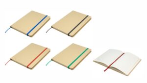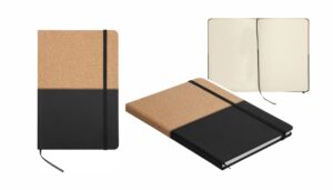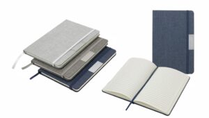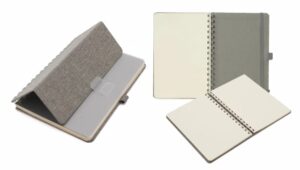 Cuaderno anillado de 80 hojas lisas de 70gr. Tapa dura confeccionada en RPET, material hecho con botellas de plástico recicladas. Su tapa delantera puede doblarse, creando un soporte para teléfono. Cuenta con cierre elástico y porta lapicera. Colores disponibles: gris, rojo y azul. Medidas: 21 x 15 cm