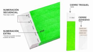 También te garantizarán que no podrán ser retiradas sin romper el cierre de seguridad adhesivo que llevan incorporado, siendo totalmente personales e intransferibles ya que para quitárselas hay que romperlas. Tanto las pulseras tyvek como las de vinilo u holográficas pueden personalizarse con logo o texto y numerarse.
