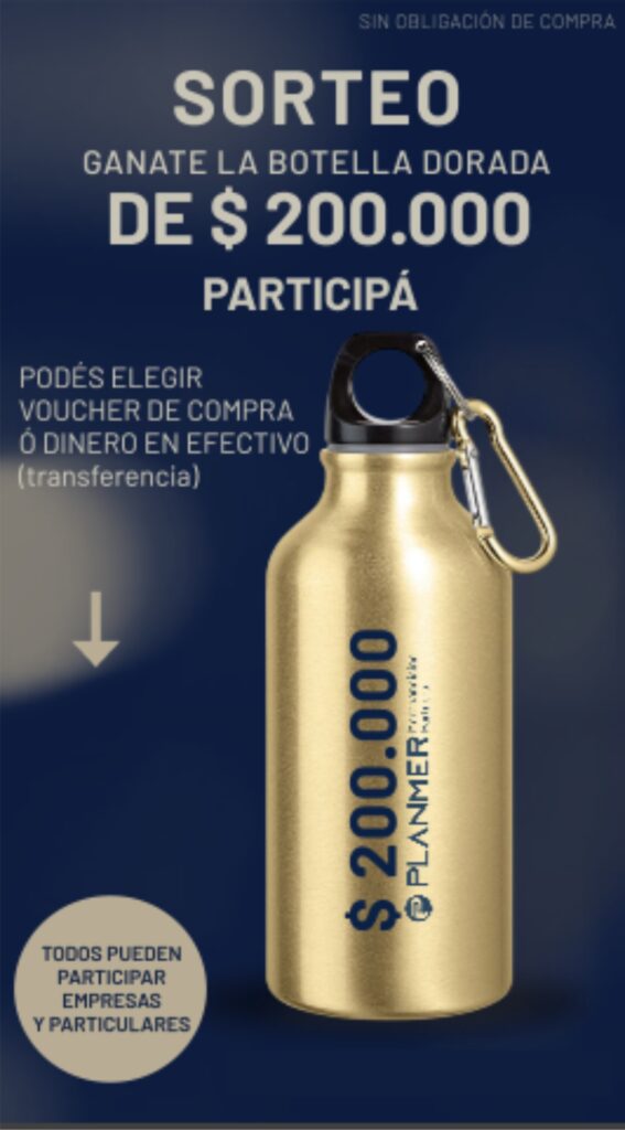 k) Se le ofrecerá al ganador/a la posibilidad de enviarle la botella. Se trata de una (1) botella metálica 400cc. con logo de Planmer. Si el ganador/a quiere recibirla en su domicilio, el costo de envío es a cargo del ganador/a.