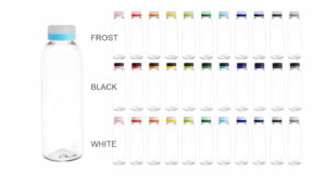 Botella deportiva de copoliester cristal con tapa a rosca, vaso inferior y agarradera de PVC color blanco, con arandela hermetizante, decoración exterior de color en silicona en cuerpo y tapa.