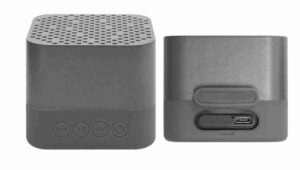 Parlante/bocina bluetooth cuadrado, en la parte inferior goma antideslizante. Botones de Power: on/off, botón de avance y retroceso que presionandolo durante unos segundos aumenta o disminuye el volumen y presionando solo una vez avanza o retrocede hacia otra canción, botón de play/pausa, luz led indicadora de encendido y entrada USB. Medida 5,8 x 5,8 x 4,8 cm x 3 cm (abierto)