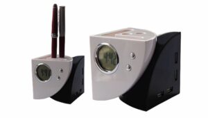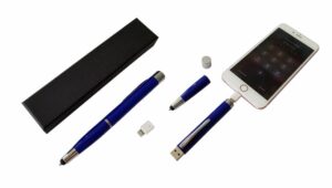 Bolígrafo metálico con power bank integrado y touch. Puntera: Apertura del bolígrafo medio giro desde el touch. Cuerpo central Power Bank: Desenroscando el cuerpo aparece el conector para celular tipo B micro USB para la utilización de la carga (1000 mAh), provee un adaptador para I phone 5 y 6, y otro para la línea S8 y S9. Removiendo un capuchón detrás del clip posee una ficha USB para su carga.